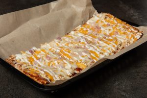 Sweet BBQ, shredded chicken, red onions, and mix of cheddar & mozzarella cheese with a drizzle of ranch.